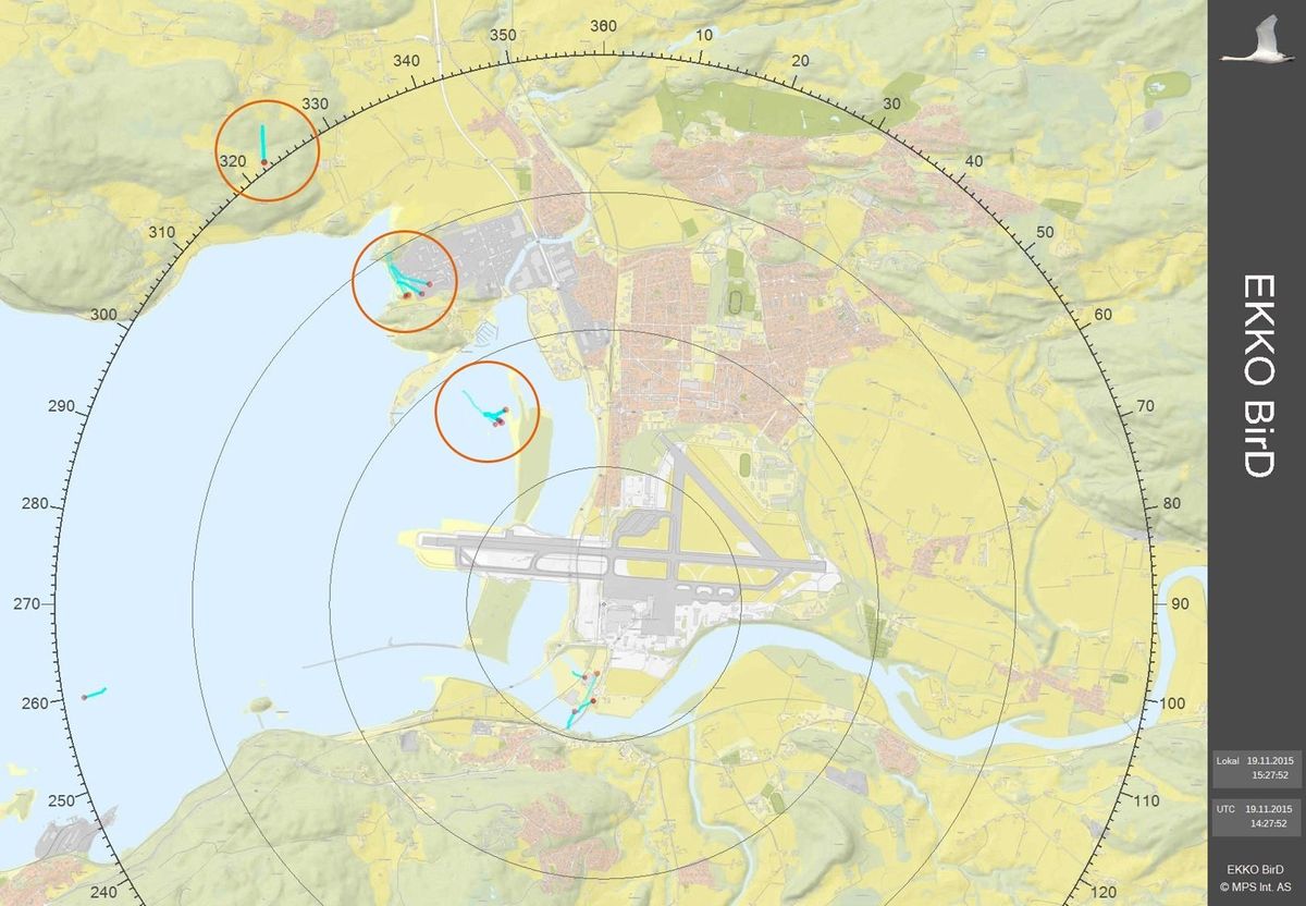 EKKO BirD signalprosessor mottar ekkosignalet fra radaren. Den legger ut fuglenes posisjoner som leses av LAN-tilknyttede klienter for presentasjon av radarbildet til bakkepersonell og flygeledere. I radarbildet over vises track på 3 flokker (i røde ringer) som kommer inn mot rullebaneområdet fra nordvest.